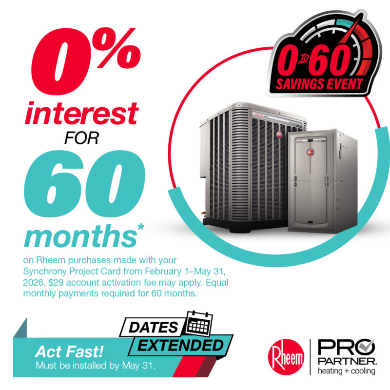 Post Copy: Great news! The 0-to-60 Savings Event has been extended through May 31, 2026, meaning you have an extra month to pay ZERO interest for FIVE years (with equal monthly payments) on that high-performance comfort system you’ve been eyeing. Call now to ensure you take advantage of this one-of-a-kind offer.